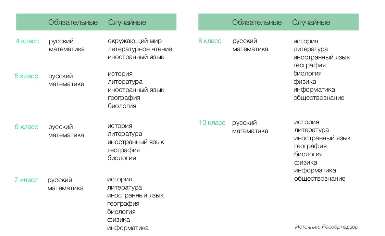 ВПР в 4-м классе Обязательные предметы: русский, математика. Предмет по случайному выбору (один): окружающий мир, литературное чтение, иностранный язык. ВПР в 5-м классе Обязательные предметы: русский, математика. Предметы по случайному выбору (два): история, литература, иностранный язык, география, биология. ВПР в 6-м классе Обязательные предметы: русский, математика. Предметы по случайному выбору (два): история, литература, иностранный язык, география, биология. ВПР в 7-м классе Обязательные предметы: русский, математика. Предметы по случайному выбору (два): история, литература, иностранный язык, география, биология, физика, информатика. ВПР в 8-м классе _Обязательные предметы:_русский, математика. Предметы по случайному выбору (два): история, литература, иностранный язык, география, биология, физика, информатика, обществознание. ВПР в 10-м классе Обязательные предметы: русский, математика. Предметы по случайному выбору (два): история, литература, иностранный язык, география, биология, физика, информатика, обществознание.